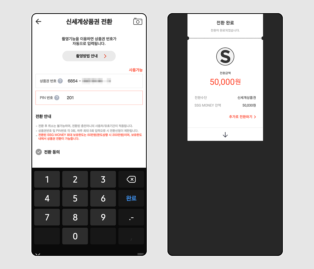 이런식으로 신세계 상품권을 모두 충전하면 된다.