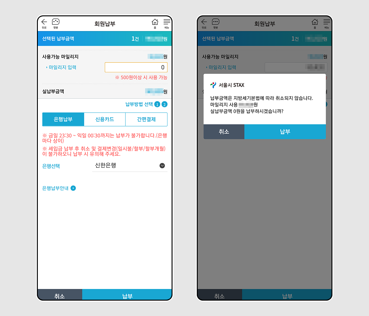 그 후 세금 납부시 사용 가능 마일리지의 금액을 입력해주면 마일리지로만 세금 납부가 가능하다.