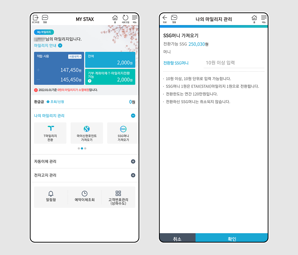 이런식으로 원하는 금액을 쓱머니에서 가져와서 STAX 마일리지로 전환한다.