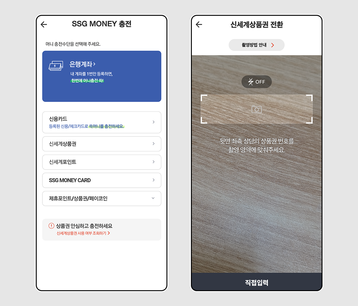 쓱페이 어플을 실행해서 쓱머니 충전에 들어가면 신세계 상품권 메뉴가 있다.