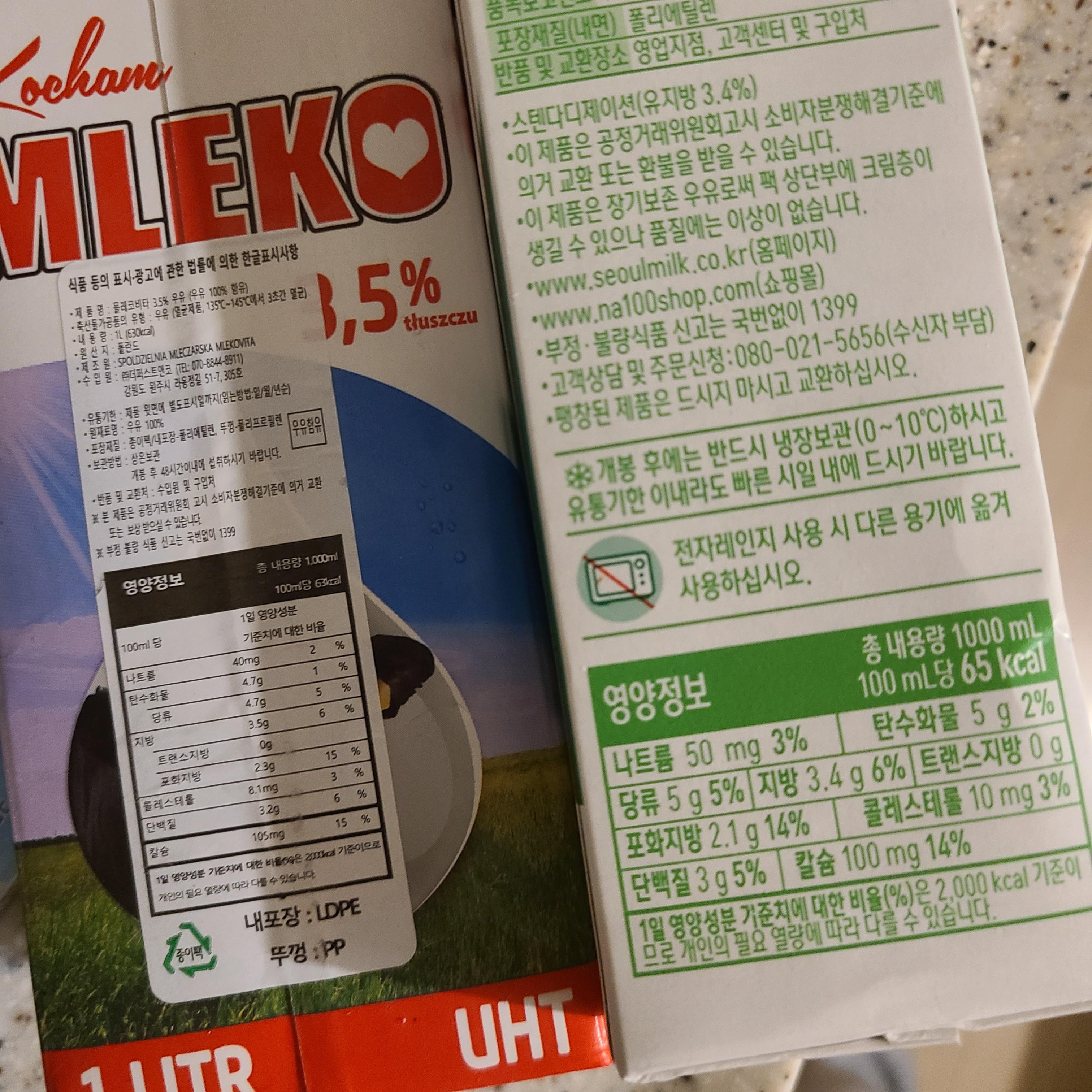 추가로 믈레코비타 3.5%가 궁금해서 서울 멸균우유랑 비교해봤더니...