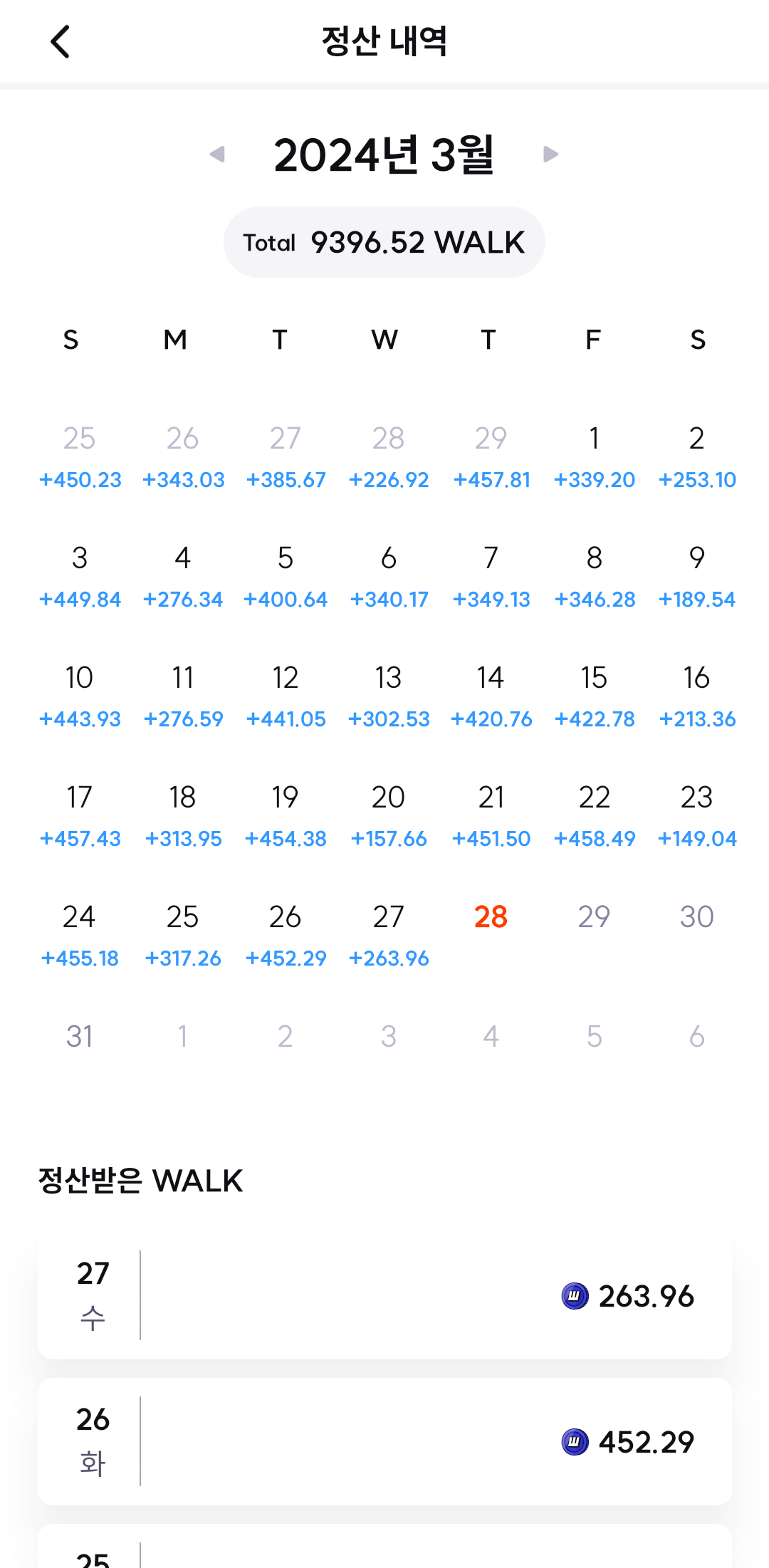 현재 2024년 3월 28일 기준 WALK 가 77원 정도로 하루 평균 340코인 정도로 계산하면 26,000원 정도 수익을 얻는 셈.