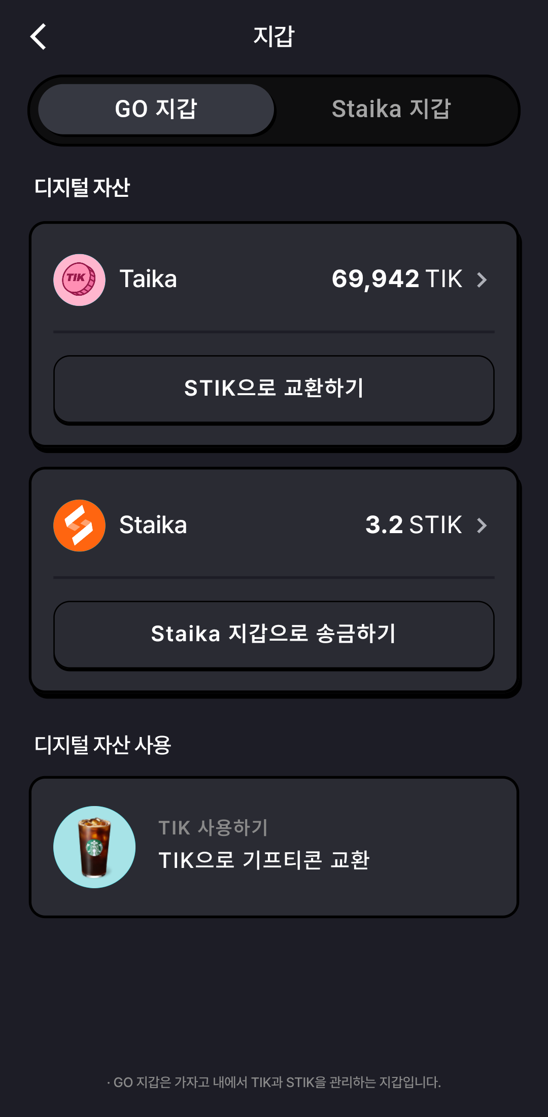 코인은 TIK 으로 분배받고 코인을 STIK(스타이카) 코인으로 앱 내에서 스왑(전환) 할 수 있다.