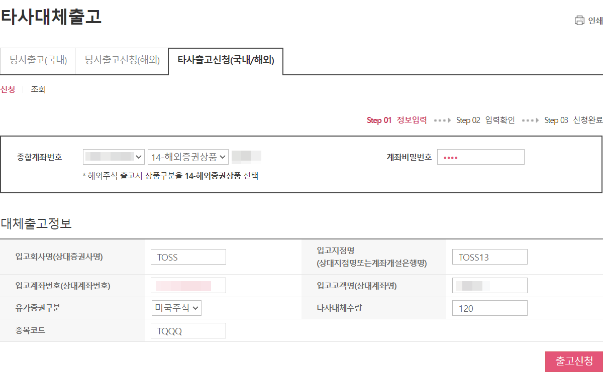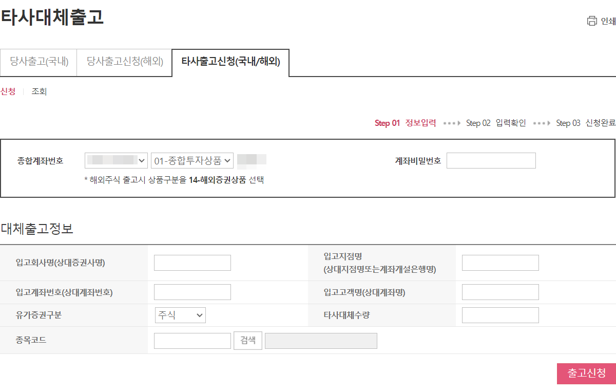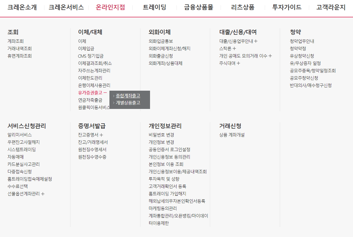 메뉴 : 온라인지점 → 유가증권출고 → 종합계좌출고