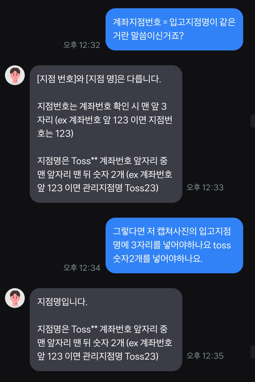 입고지점명 때문에 토스 상담원과 상담을 했다.